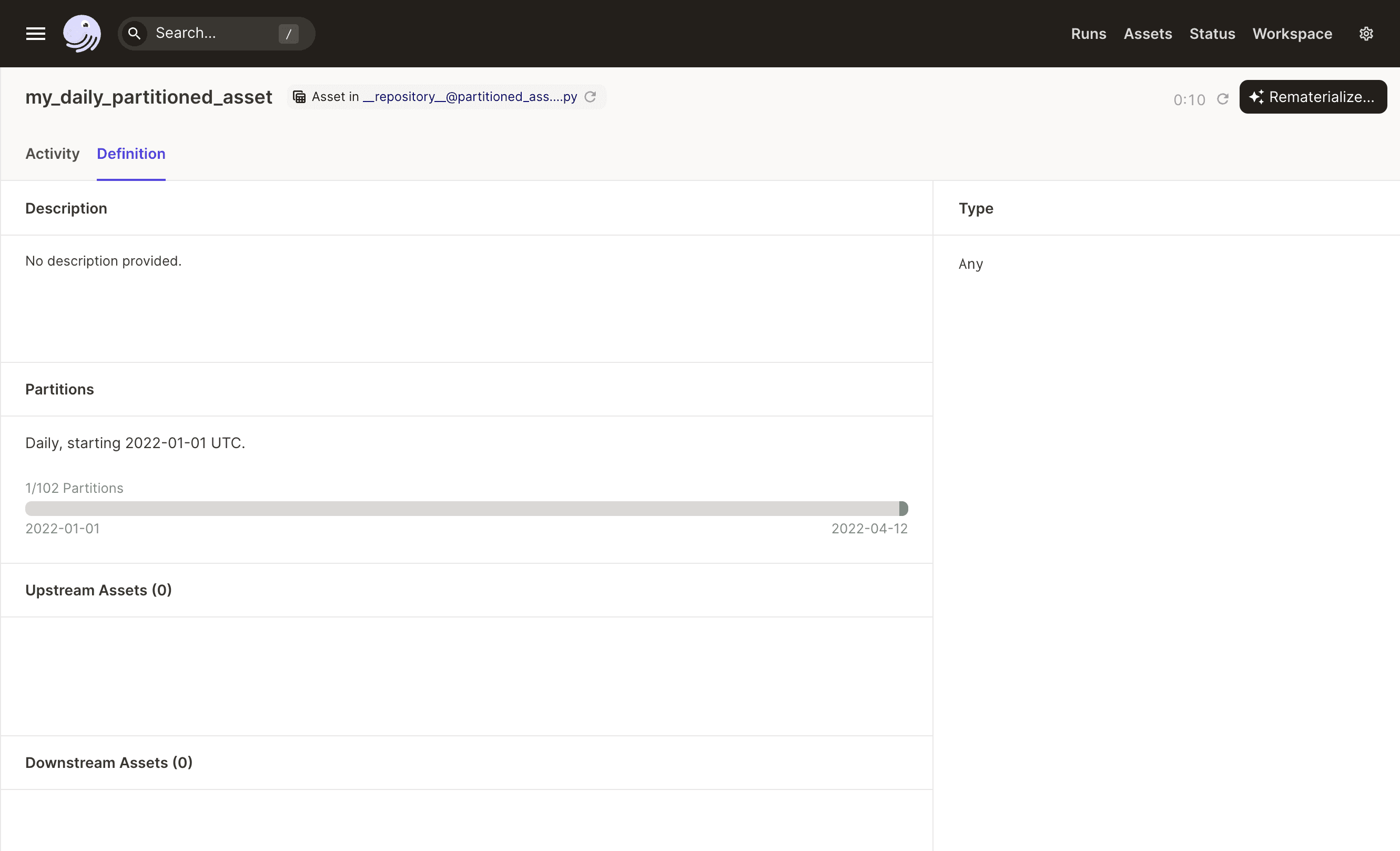 To view materializations by partition for a specific asset, navigate to the Activity tab of the asset's Details page:
